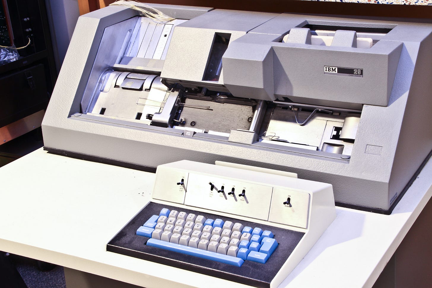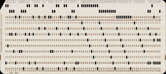 Step one was to buy blank punch cards at the college book store. They were sold in batches of 100. The I had to find the compuer center with the keypunch machines. A kepunch machine was a desk size thing with a typewriter keyboard and an elaborate mechanism for feeding in blank cards. Each letter you typed was encoded in a column of what seem like random holes in the card. If your particular machine had decent printing ribbon in place the character was also shown on the top. The funny thing was that it was hard to see what it was you were typing, so it was easy to make a mistake. Of course, you couldn’t fix the card – can’t fill in the holes – so a card was wasted and you had to start over.